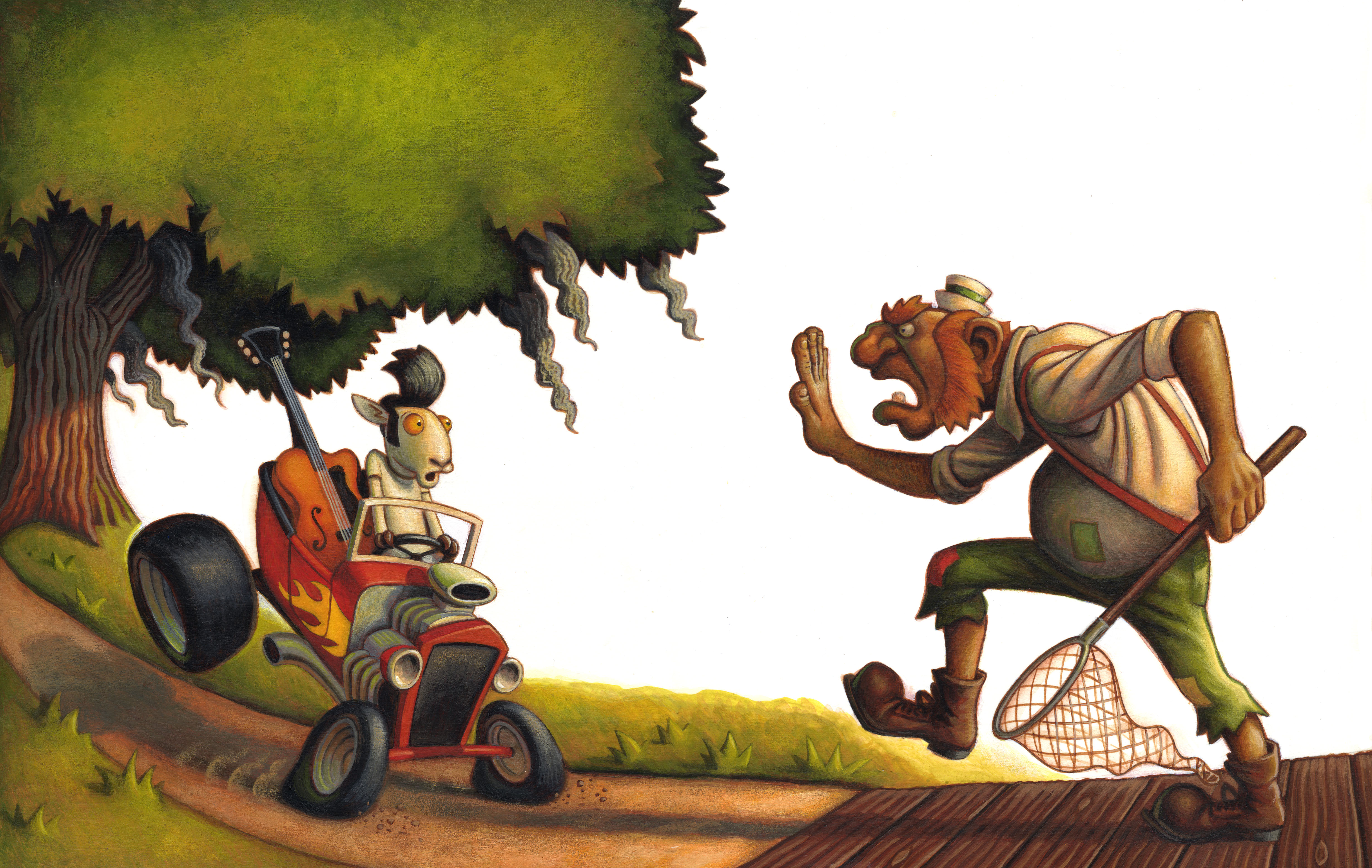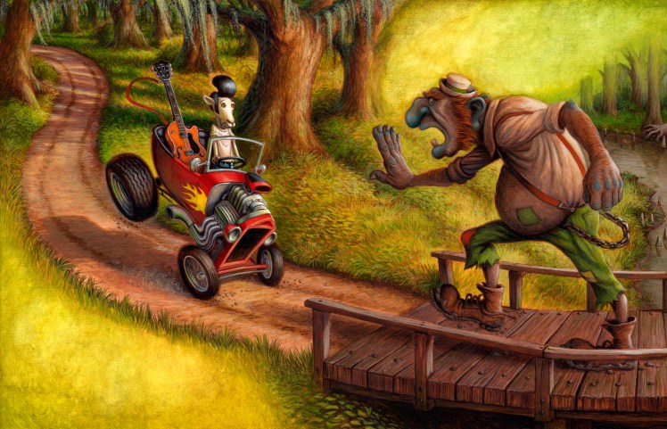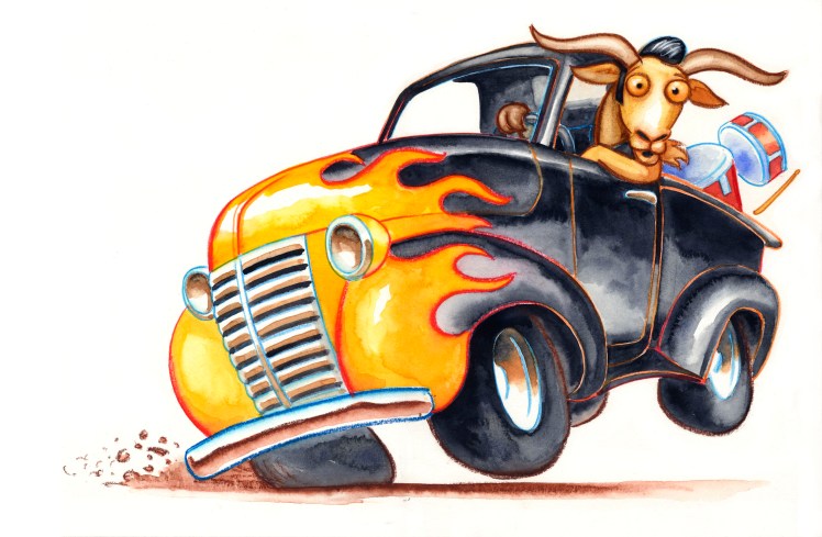 I have written and created sample illustrations for a new picture book called The Rockabilly Goats Gruff. It’s the story of three southern, rock’n roll goats trying to get across the bayou to a gig they’re playing at the Shimmy Shack. However, under the bridge lurks a grumpy old troll who doesn’t like the ruckus the goats make with their hotrods and instruments.