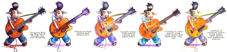 So I left my comfort zone and acrylics behind and did this series of character studies of Billy Lee, the youngest goat. I started with the fully rendered, fully detailed, acrylic goat on the left and started using watercolors and simplifying. I tried introducing non-local color by outlining the character. I was told close but not quite. At this point my editor, who fully supported the book, gently told me to shop it around elsewhere. He couldn’t convince the higher ups, art director, or marketing to acquire this project. I got the blues. It’s hard reinventing yourself mid-career especially with everything else in the industry changing. All of my newspaper and magazine clients have been scaling back or disappearing and all of my book publishing art directors keep leaving their positions. Wiener Wolf seems to be quite successful, but I need another kid’s book to get picked up, now!