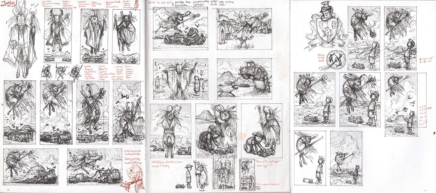At first, the conflict I was going to create was going to be between the Jackelope and the tractors. But after several thumbnails, I realized there isn’t a lot of drama to be created with a rabbit creature facing off with an inanimate object. I tried the tractor as a rotting carcass with crows descending upon its rusting hulk. But that made the Jackelope victorious and I wanted to show the face-off. So I injected a human boy into it. A boy with a white cowboy outfit on, pulling the tractor. Leaving a trail of destruction behind him. This figure has appeared in other art I have done. He represents the young and naive but destructive force that mankind is on this ancient planet. The final thumbnail ended up looking like this: