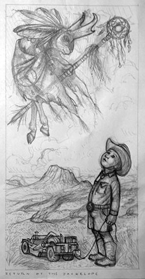 This is the tight sketch I created for The Return of the Jackelope. I scanned into my computer the thumbnail sketch I thought worked best (as seen in the previous post) and enlarged it in Photoshop. I then reduced the output levels using the Levels adjustment, so that when I printed it out, the sketch would appear very light. I then drew this much tighter/detailed version on top of it. Nothing fancy, just a #2 pencil and regular printer paper. You may be wondering, are those tiny volcanoes in the sketch? They are in fact, a burning prairie dog town. I discussed the inspiration for this image in my last post, as being my time spent in the Colorado foothills and my reaction to the suburban sprawl. Well, my in-laws have lived in a very large neighborhood development in Castle Rock for many years. Only sections of the development were completed and in the empty spaces, which were very large areas of high plains desert, there lived prairie dogs. It was always such a thrill to see the little critters scurrying between burrows and peeping from their holes. Then one day they all disappeared. And a week later, construction began on those sites. I don’t know for sure what happened to the prairie dogs, perhaps the developer trapped them all and relocated them to some other part of the prairie, but I doubt they went through the trouble and expense of doing that. So, that is the reasoning behind the scorched earth imagery  left in the wake of this kid and his tractor.