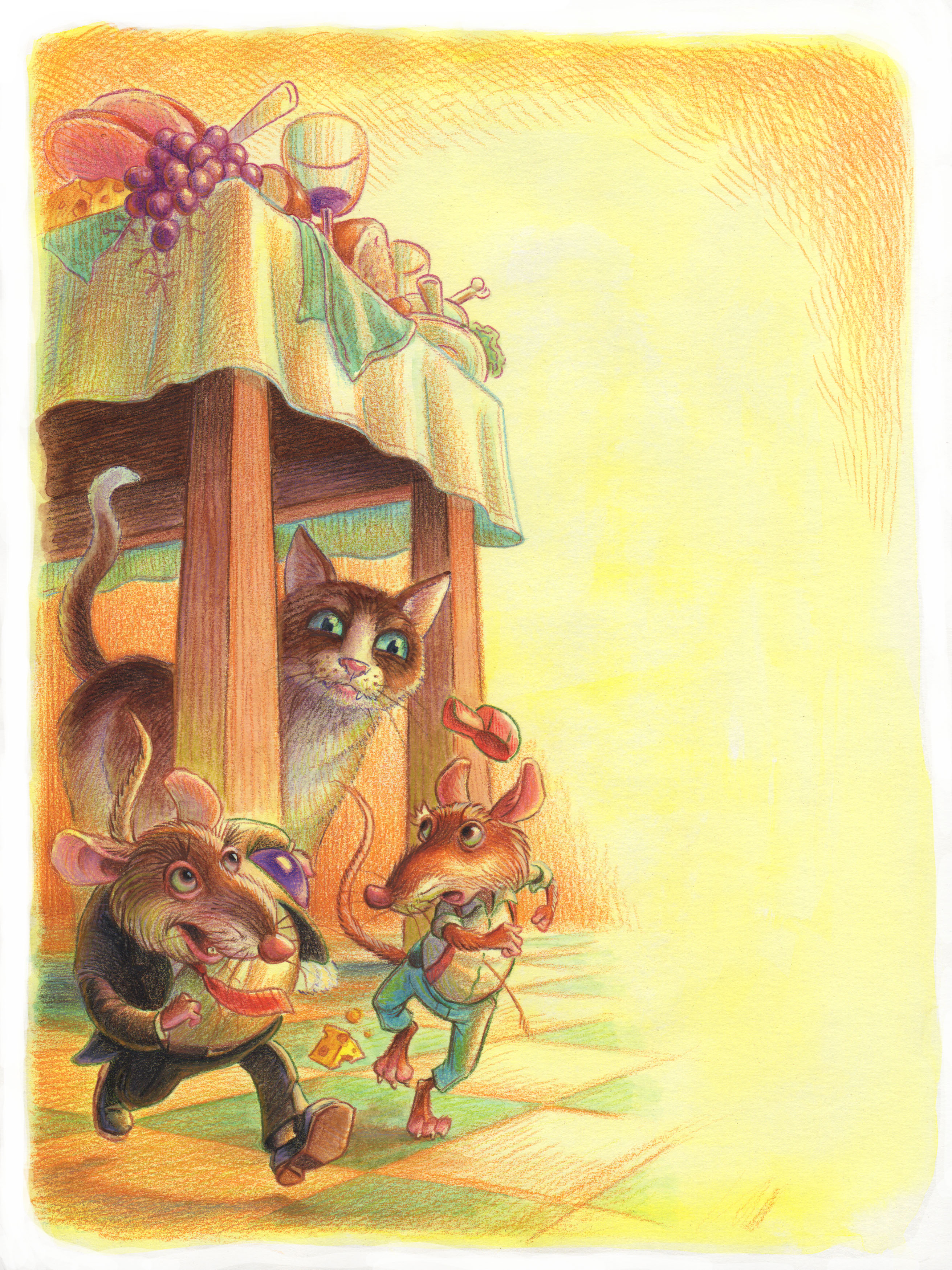 Up till this illustration, I had only used a yellow wash for the underpainting when using this technique. Because this image depicts mice in a dark hole, I thought I’d try using a blue wash. It worked pretty well. This fable is Belling the Cat. The moral is: mice look ridiculous in WWII uniforms.