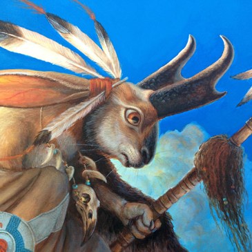 To transfer my sketch to the six foot tall canvas, I enlarged the drawing in Photoshop to the right dimensions and then divided it up and printed it in 11″ x 17″ panels. I taped them all together and then to the canvas. Next, using old fashioned carbon paper placed underneath the sketch, I traced … More Return of the Jackelope – Step 3 – Transferring the Drawing and Underpainting